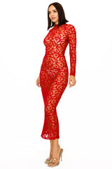 Red sheer long sleeve mock neck floral lace midi dress