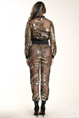 Sheer Mesh Sequin Zip Jacket Silver Gold Jogger Pants Mesh Tracksuit Set